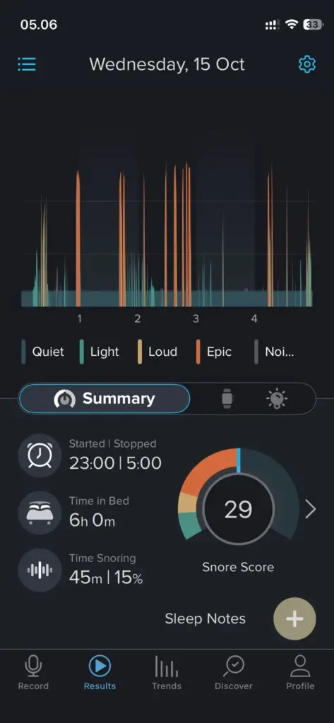 Kemarin aku coba SnoreLab. Skor Ngorok 29. Kategori ringan sampai sedang.