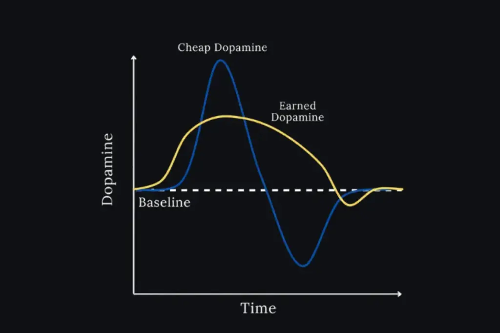 Sama kayak gula darah yang crash setelah makan makanan manis. Dopaminmu nggak cuma turun ke baseline normal. Dia turun DI BAWAH baseline.