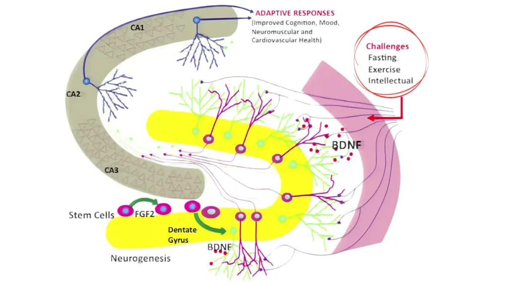 Dr. Mattson juga menjelaskan bahwa tantangan pada otak (seperti puasa, olahraga, atau belajar hal baru) akan mengaktifkan sirkuit saraf dan meningkatkan faktor neurotropik seperti BDNF. Ini mendorong sel-sel otak untuk tumbuh, membuat koneksi baru, dan memperkuat koneksi yang sudah ada.