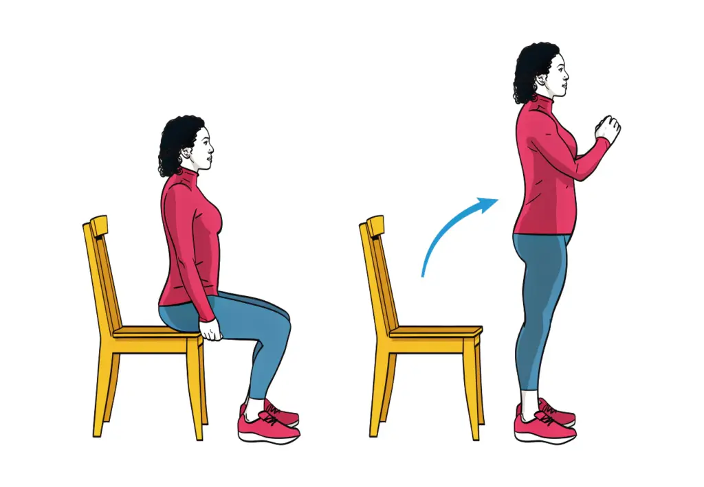 - Berdiri dari Posisi Duduk – bangun dari kursi dengan benar tanpa bantuan tangan