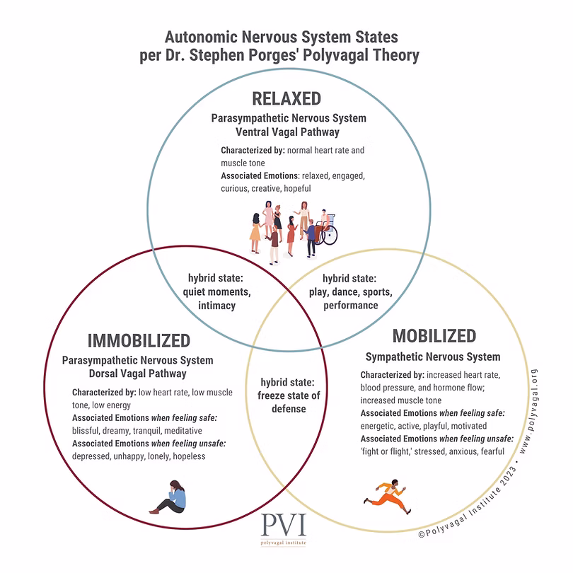 Stephen Porges, neurosains yang ngembangin Polyvagal Theory, mengajarkan kita kalau sistem saraf manusia punya tiga mode utama: mobilization (fight or flight/bahaya), immobilization (shutdown/mengancam jiwa), dan relaxed (safe state/kondisi aman).