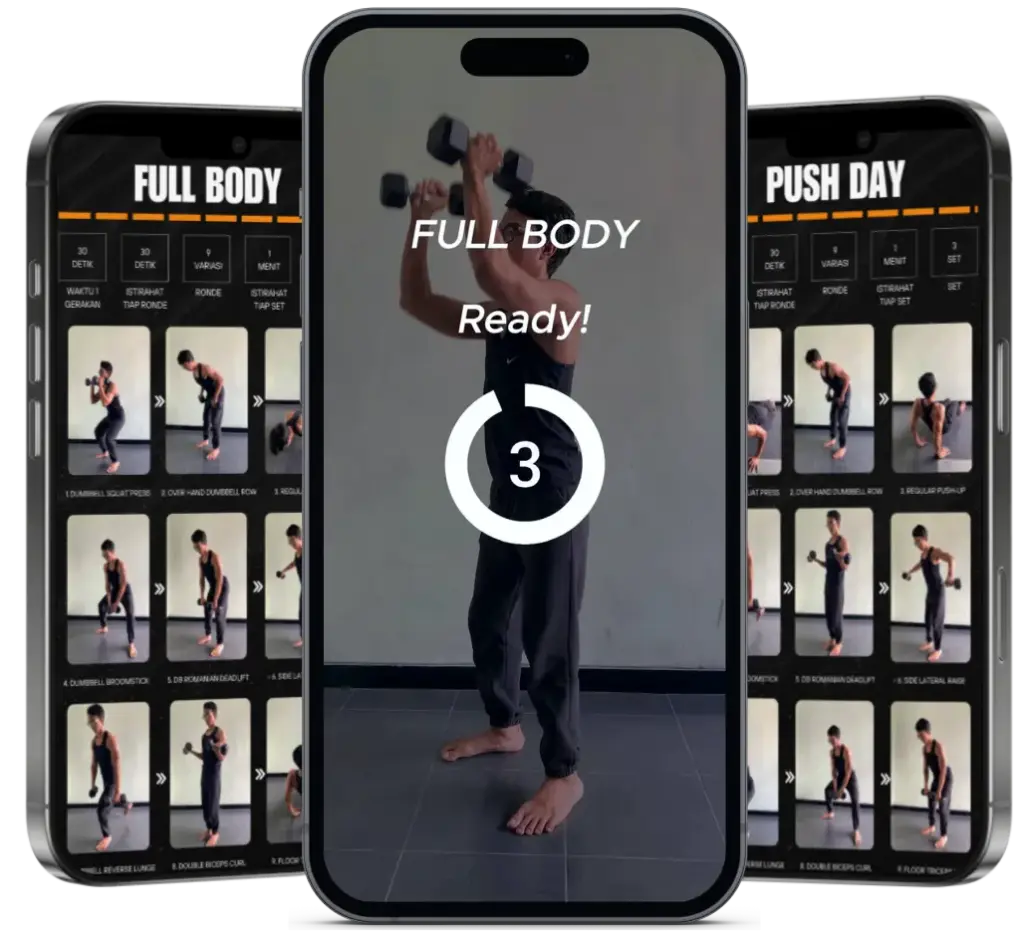 Sama sekali tidak. Semua latihan dirancang agar bisa dilakukan di mana saja, cukup menggunakan tubuhmu sendiri dan ponsel untuk mengikuti panduannya. (untuk tingkatkan intensitas, hanya dibutuhkan dumbbell 5kg atau botol Air mineral 500ml)